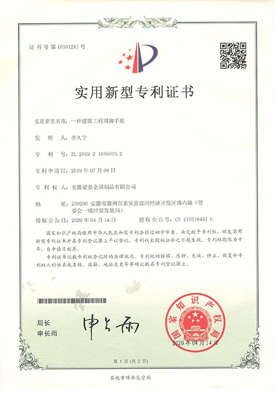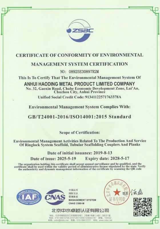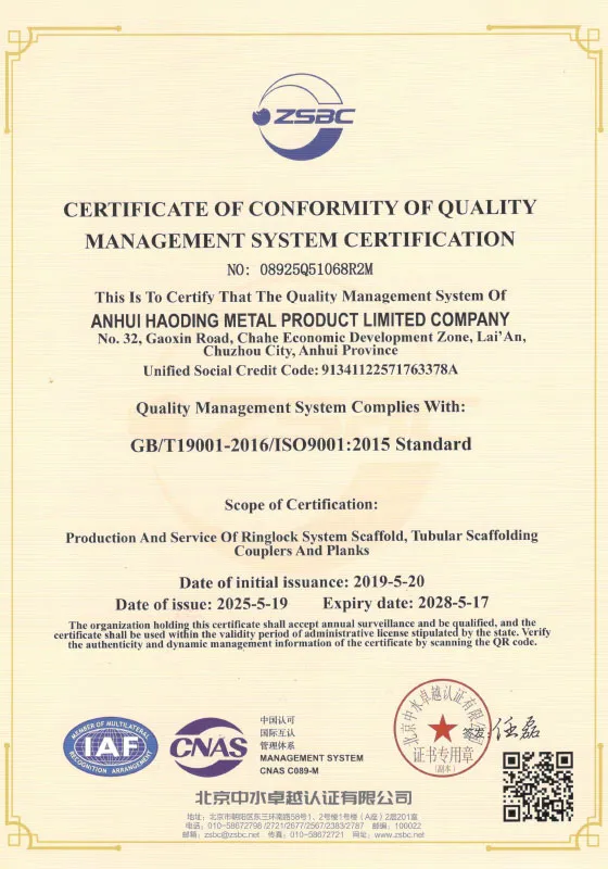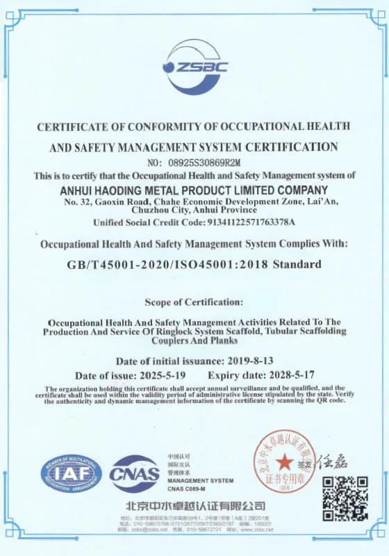 Компания Хаодин создала полную систему контроля качества и прошла сертификацию Международной системы менеджмента качества ISO9001:2015, сертификацию Системы экологического менеджмента ISO14001:2015 и сертификацию Системы менеджмента профессиональной безопасности и здоровья ISO45001:2018. В то же время продукция проходит испытания в отечественных и международных испытательных институтах в соответствии со стандартами EN74, BS1139, AS1576, EN12811 и другими. Мы твердо следуем принципу «Высокое качество — это душа, а лучший продукт — это ядро» и придерживаемся духа развития, основанного на компетентных сотрудниках, опоры на качество, поиска эффективности через опыт и стремления к сплоченности через чувство ответственности. Компания Хаодин искренне стремится обслуживать всех клиентов своими высококачественными продуктами по разумной цене и предоставлять всесторонние и разнообразные услуги.